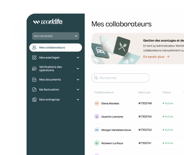 Avec Worklife, choisissez une solution unique pour centraliser et personnaliser vos avantages salariés dans le respect du cadre réglementaire. Maîtrisez votre budget tout en redonnant de l’impact économique, social et environnemental à vos dispositifs sociaux.